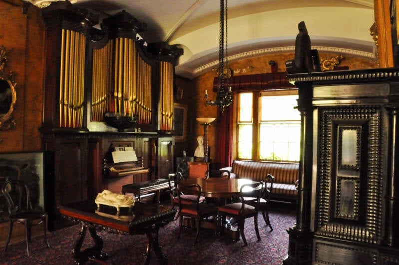 Im Obergeschoss wird der Treppenabsatz von einer Orgel dominiert.