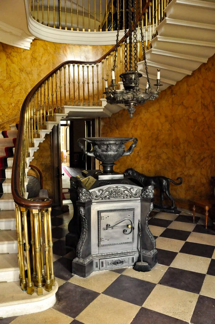 Der Flur vom Westeingang fällt sofort ins Auge. Es gibt eine freitragende Wendeltreppe, eines der schönsten Beispiele, die ich je gesehen habe. Ein großer Ofen dominiert die Bodenfläche; Elektrizität war eine späte Einführung in The Argory.