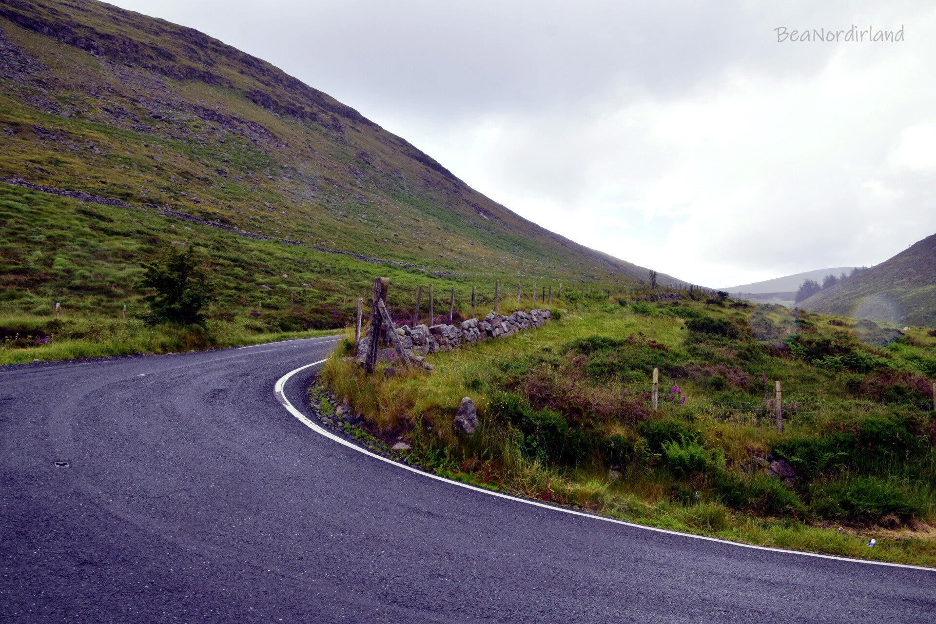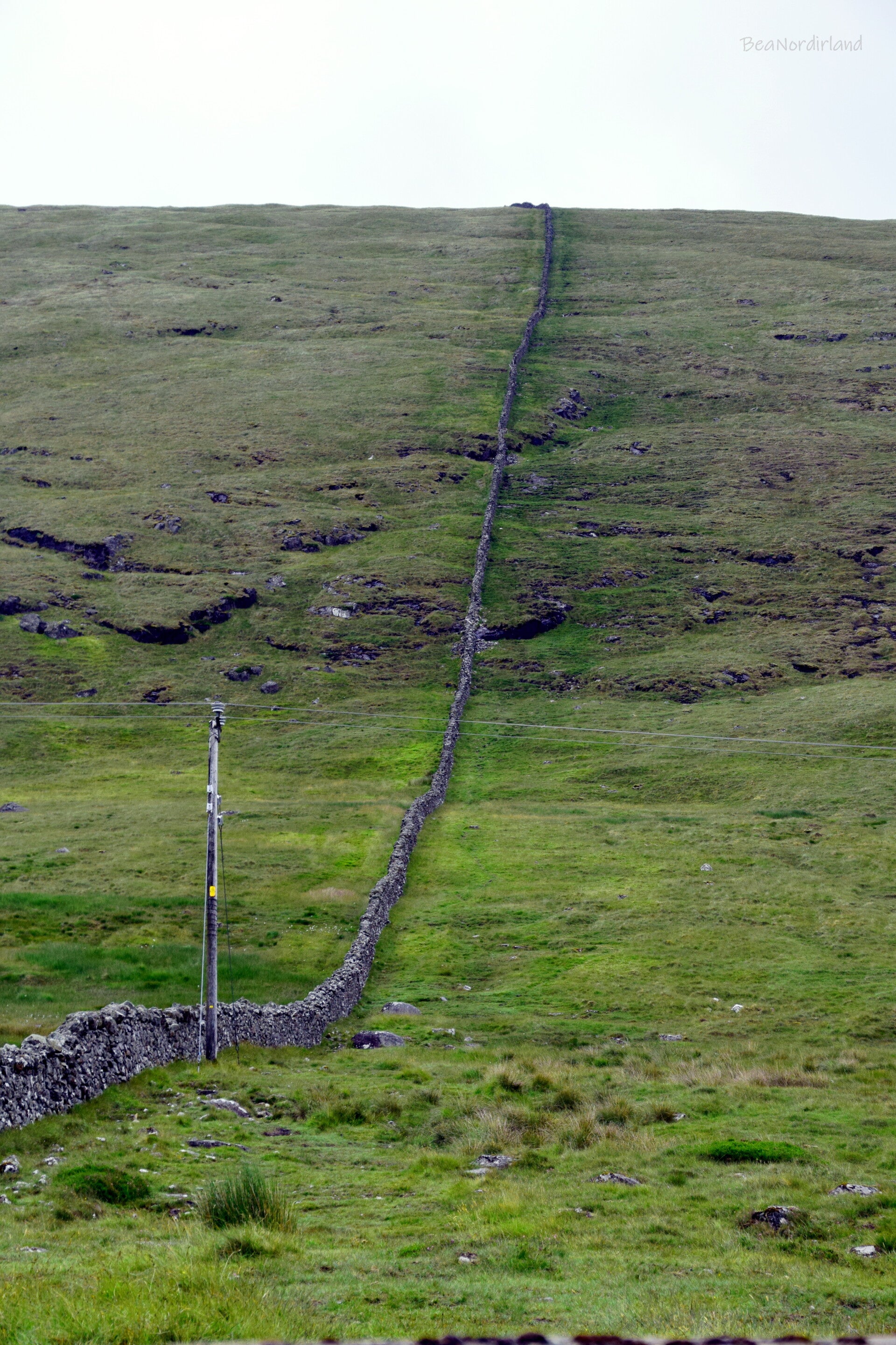 Unterwegs in den Mournes ist uns die herrliche Mourne Wall aufgefallen, die sich über 15 Gipfel der Bergkette kreuz und quer durch die Landschaft erstreckt. Außerdem standen überall weidende Rinder am Fuße der Mournes.