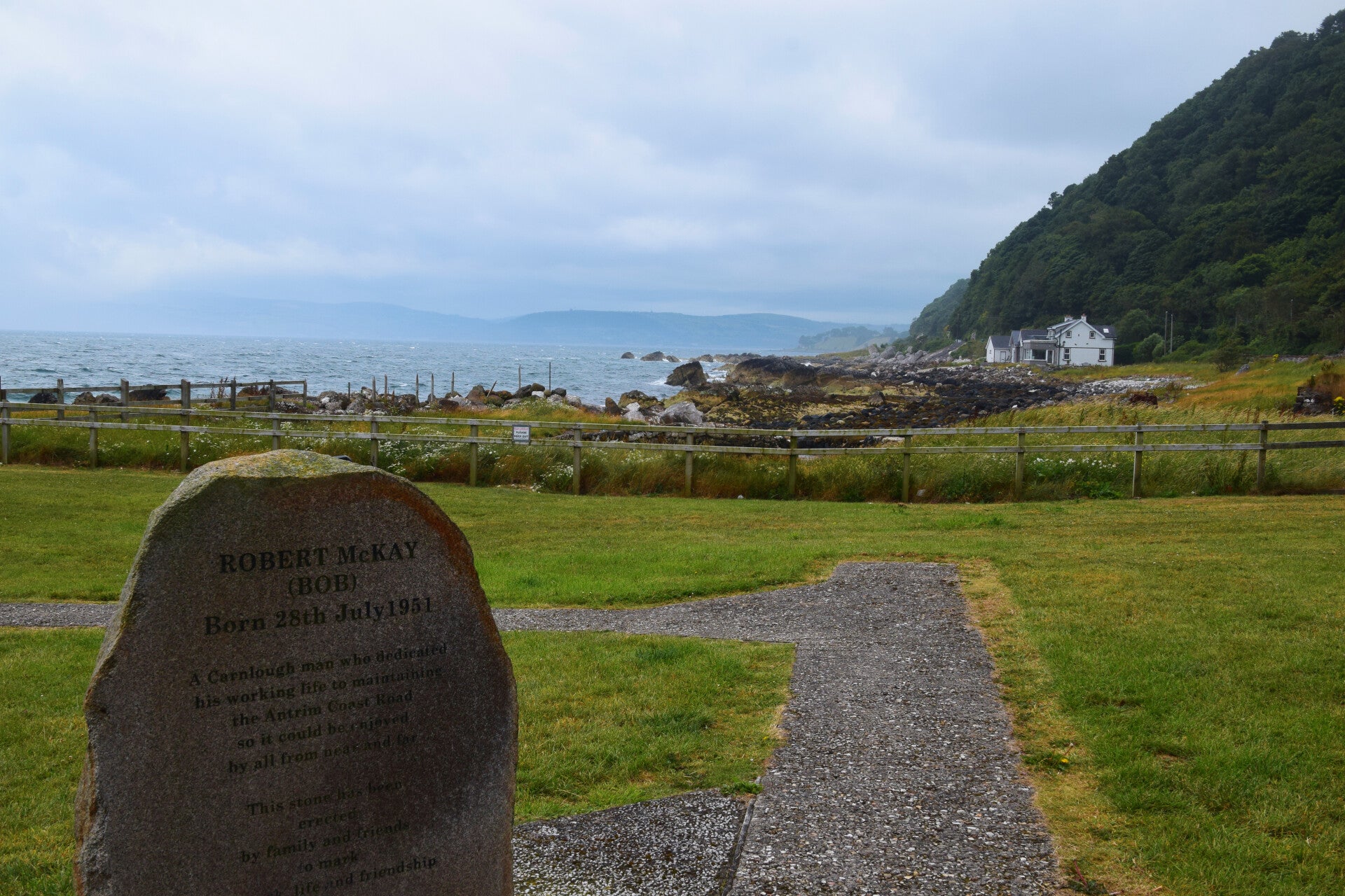 Diese Steinskulptur wurde in Erinnerung an Robert McKay für die Instandhaltung der weltberühmten Straße der Glens of Antrim errichtet. Seine Arbeit hat die Region nachhaltig beeinflusst, und zu einer der landschaftlich reizvollsten Küstenstraßen Europas gemacht.