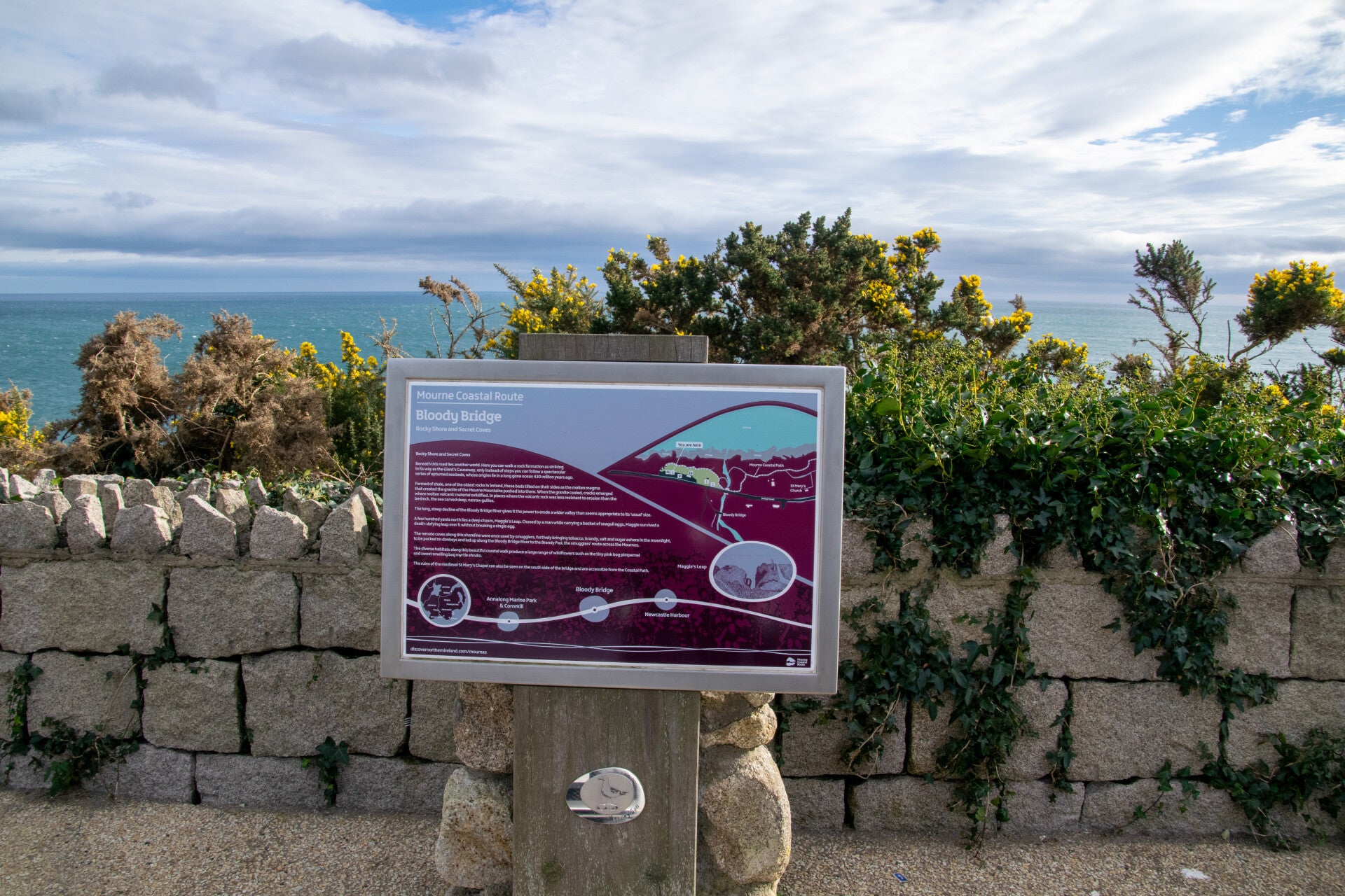 Nach unserem Kaffee ging es mit dem Auto weiter auf der Mourne Coastal Route. Der nächste halt war der Parkplatz Bloody Bridge. Mittlerweile war auch die Sonne rausgekommen. Vom Parkplatz aus begann unsere Wanderung. Wir folgten dem Schild zum Coastal Path.